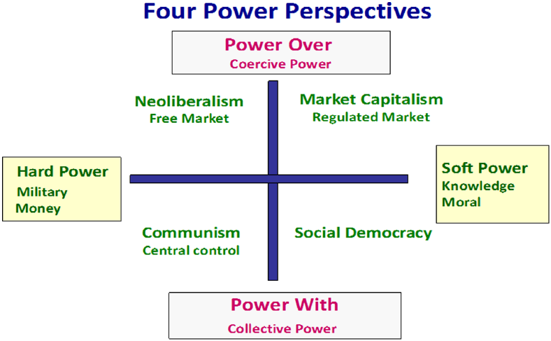 Neoliberalism thus generates distortions within the system as ‘economic growth’ becomes ever more unsustainable through overconsumption of resources, with profit before people - siphoned off out of the economy into the pockets of the wealthy - whereby human rights becomes a selective process, usually favouring the privileged, especially within the context of the split between the north and the global south. Then there’s the belief that science and technology will provide the magic bullet to cure all our ills, whilst ignoring contradictory evidence. This leads to a process of dehumanisation. The following infographic outlines power structures and relations.